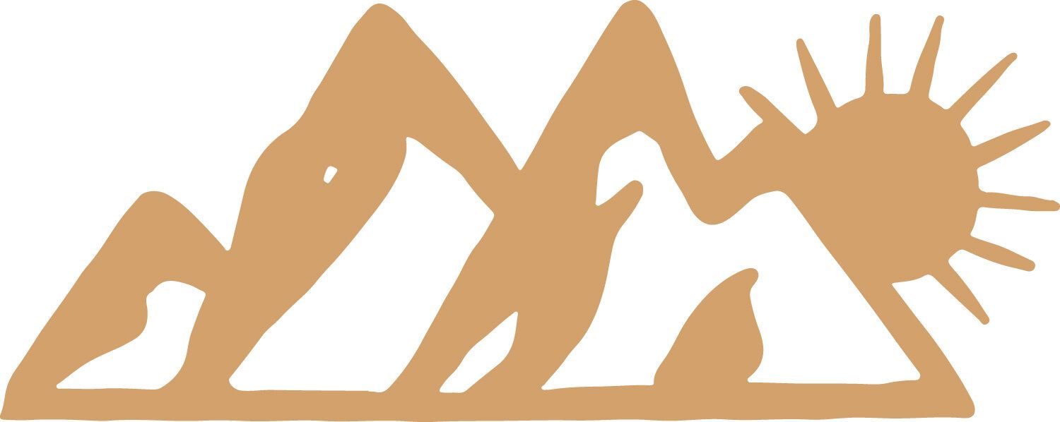 Logo for The Outpost in Big Bear Lake, California, featuring mountains, sun, and text in shades of brown and gray.